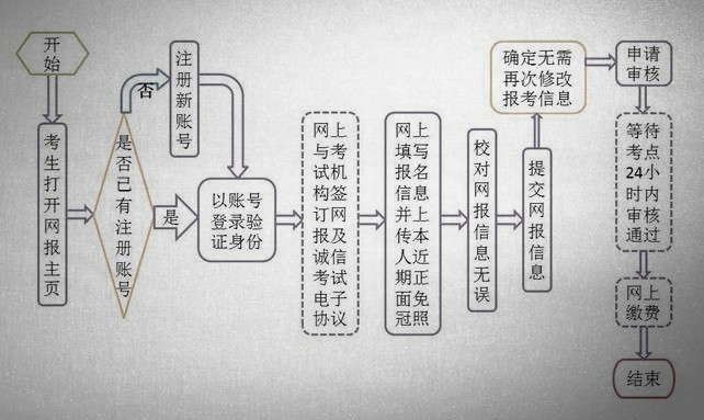 第一步:考生网上填报。准备本人近期正面免冠半身彩色证件照(规格:浅蓝色背景;成像区大小为48mm×36mm<高×宽>,要求上下方向:头部以上空1/10,头颈部占7/10,肩身部占2/10;左右方向:肩身部左右各空1/10;图像像素最小为192×144<高×宽>,图像文件为.jpg格式,文件大小在20KB-200KB之间。不得使用生活照!),在任意一台互联网终端(电脑、PAD、手机等)均可完成填报操作。流程如下图: